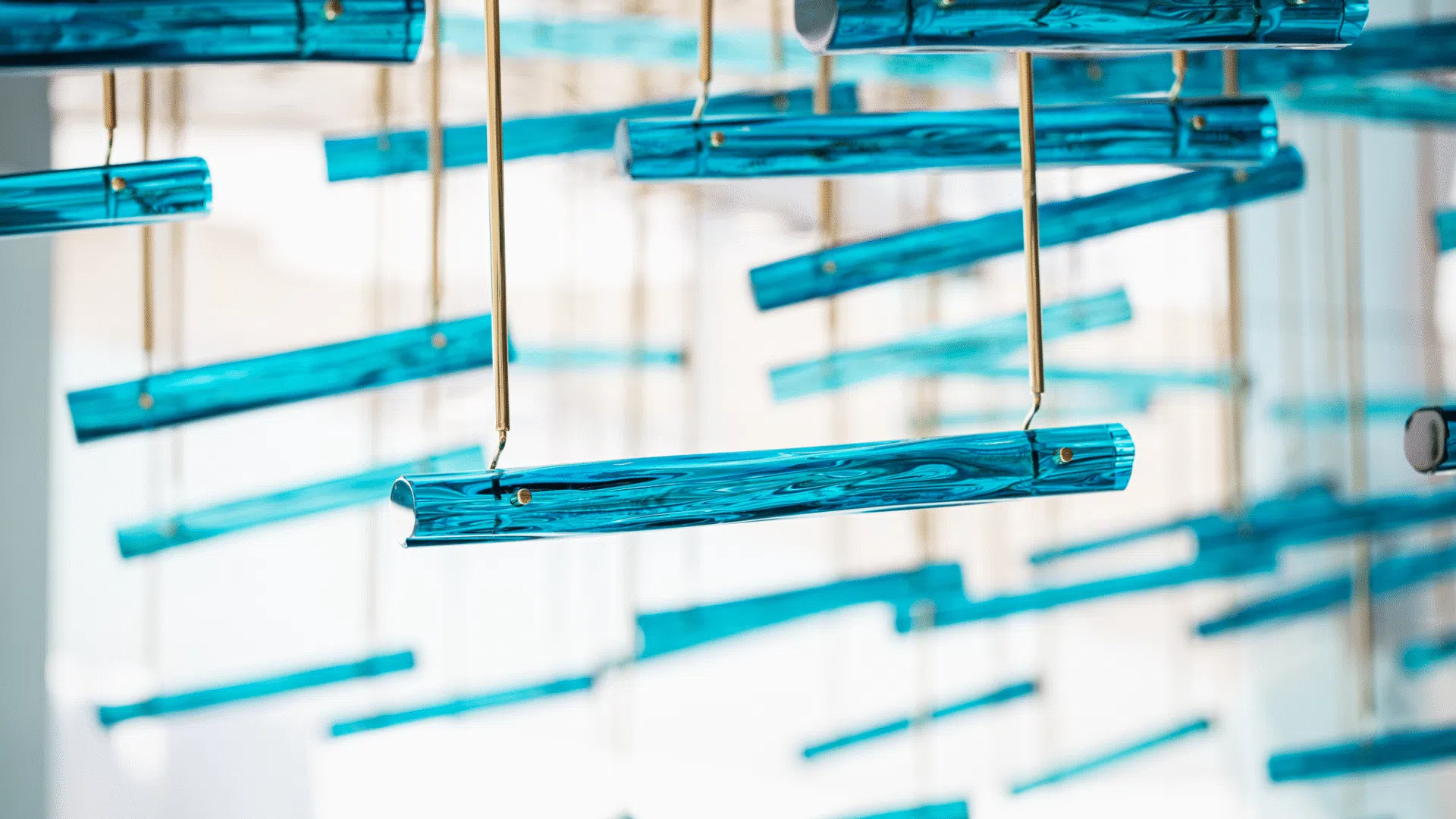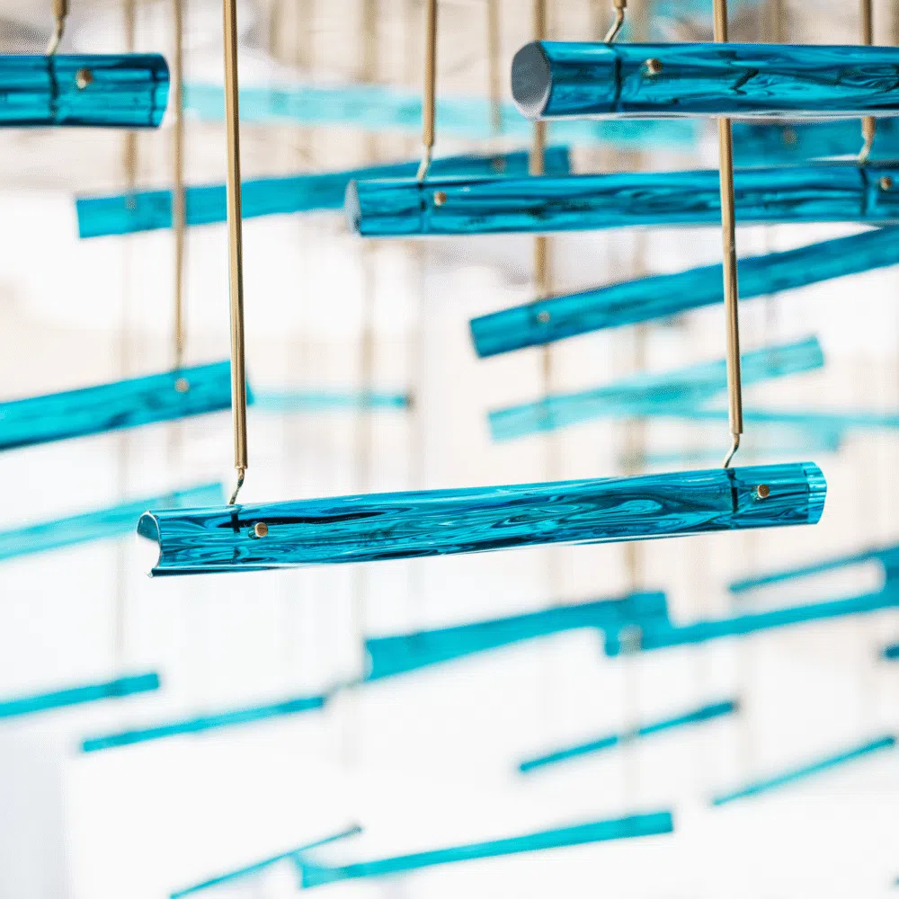 The sculpture spans eight meters in diameter and is composed of 490 hand-blown glass rods in shimmering aquamarine tones. Each element refracts light like ripples across the surface of water.