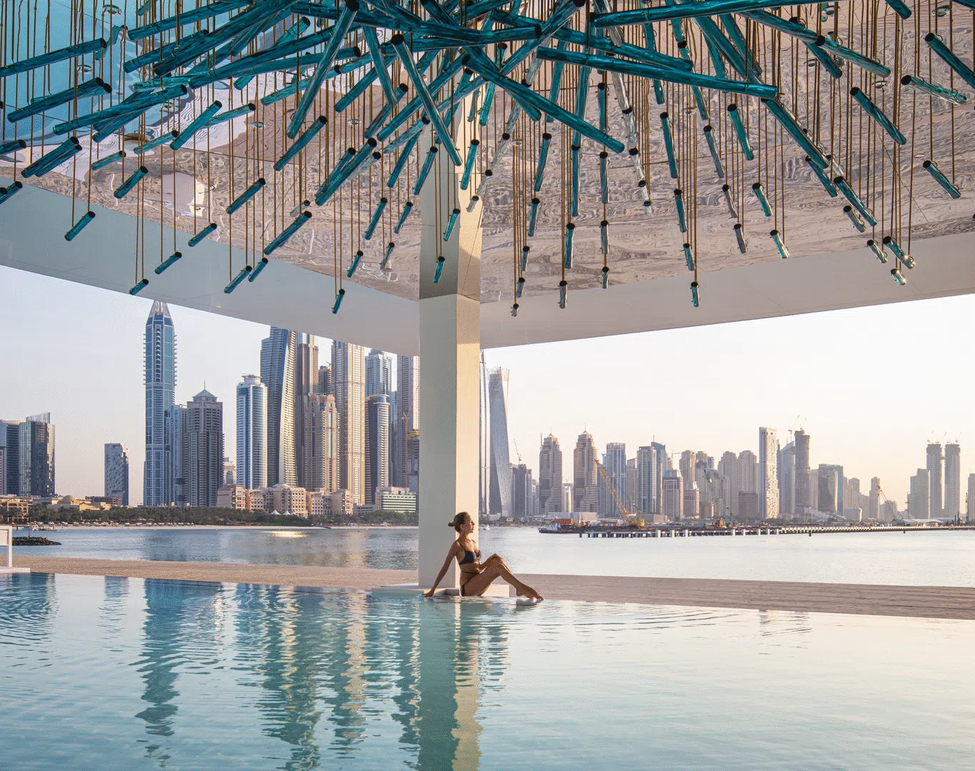 Set above the glass-lined pool at Beach by FIVE, Aquatic captures the calm and motion of the ocean. Framed by views of the Dubai Marina skyline, it becomes a luminous centerpiece of the resort’s private beach.