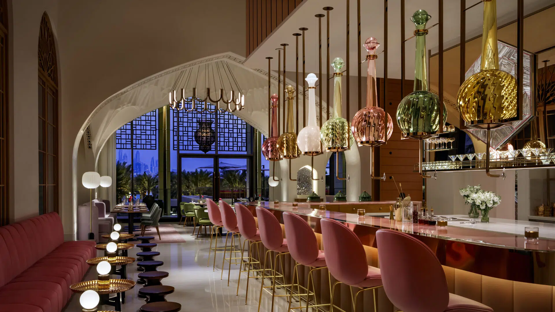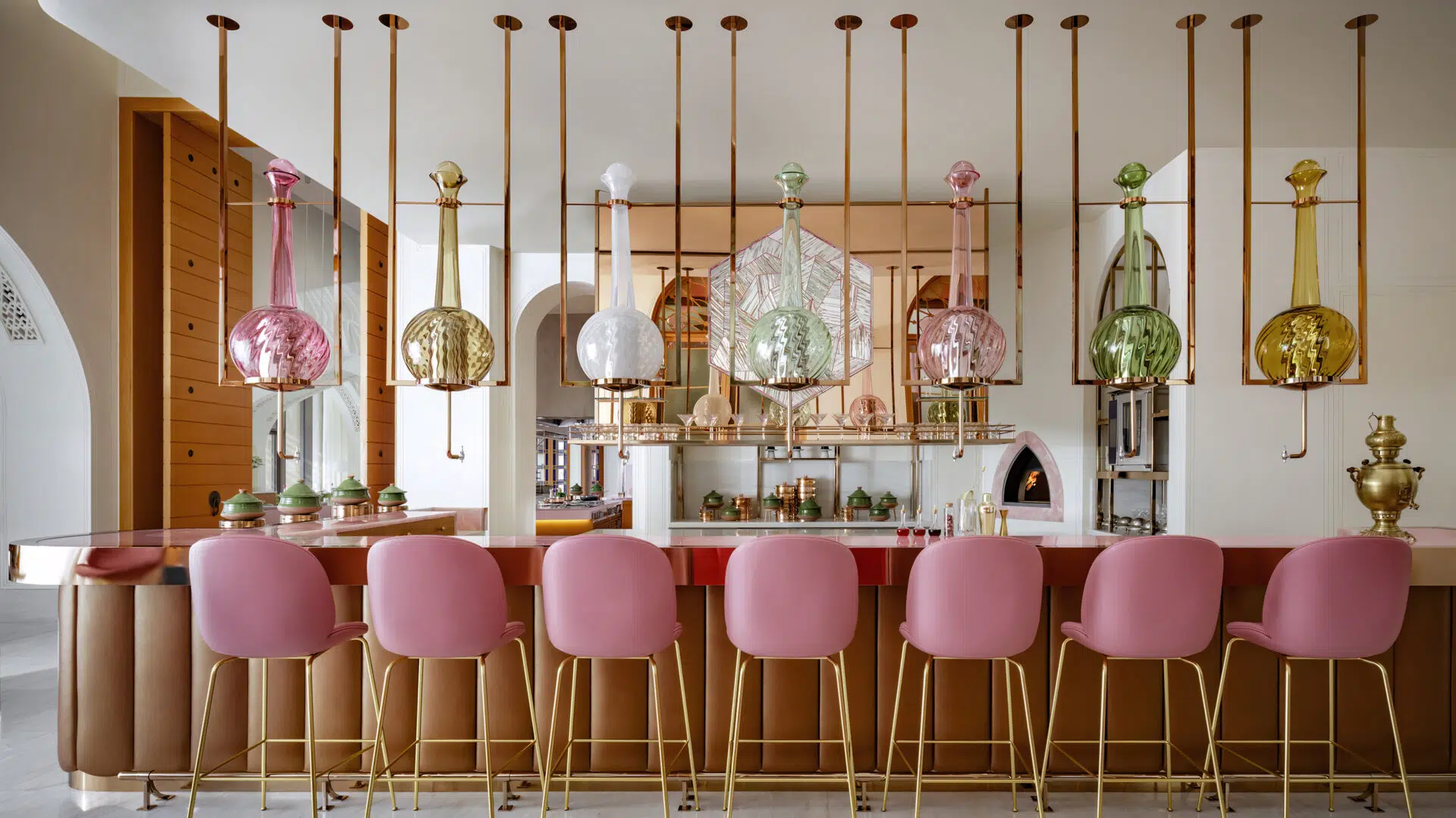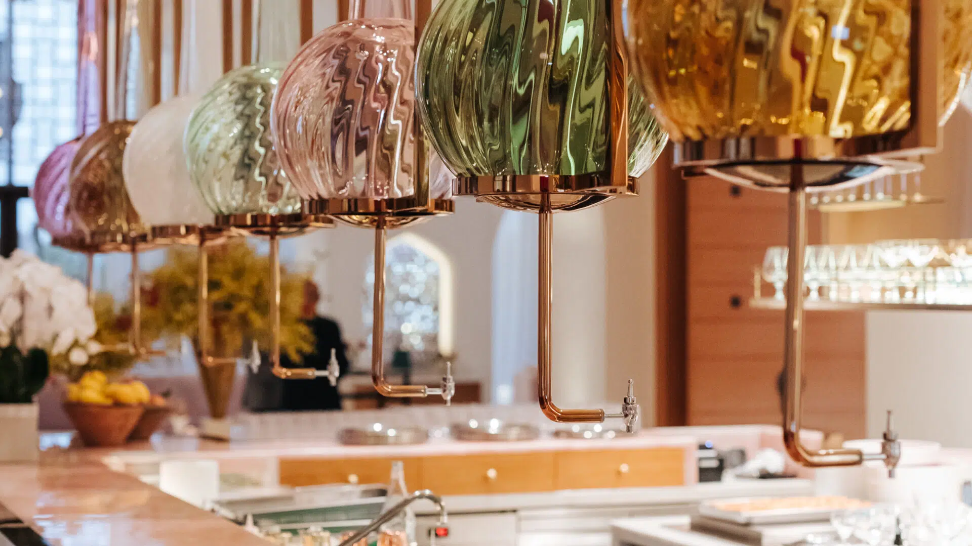 Each vessel, handcrafted in the Czech Republic, carries a delicate pastel hue and serves a dual purpose — as both decorative lighting and functional containers used by the restaurant’s bartenders.