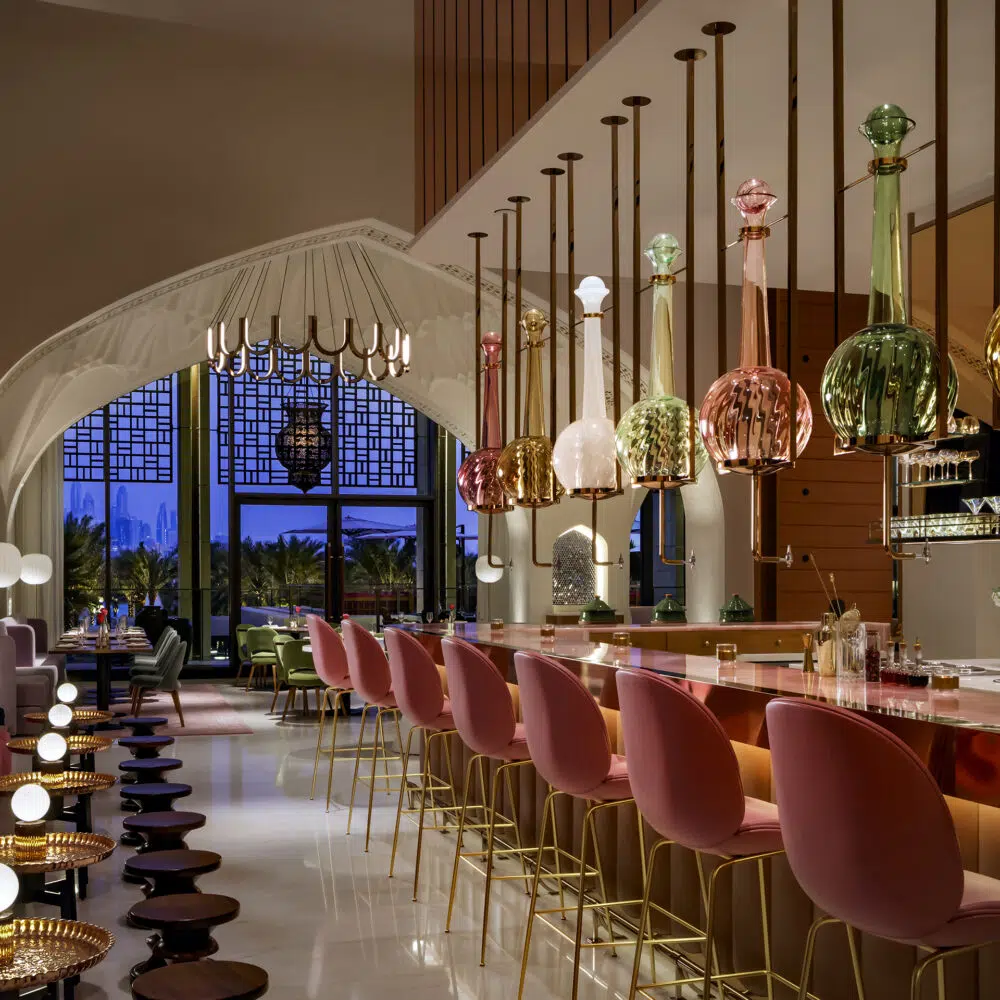 Created for Ariana’s Persian Kitchen in Dubai, Pastel Cordials reinterprets the elegance of ornamental glass bottles through soft color and form.