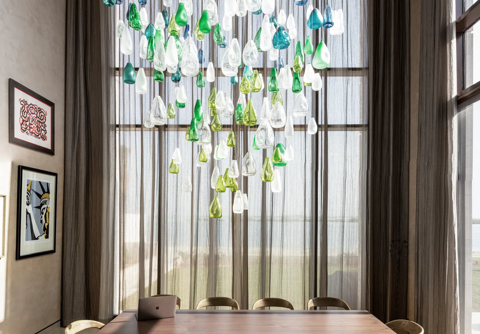 Suspended in a vertical composition measuring 2.5 m wide and 5.4 m high, the piece brings the serenity and texture of the coast into a refined interior setting.