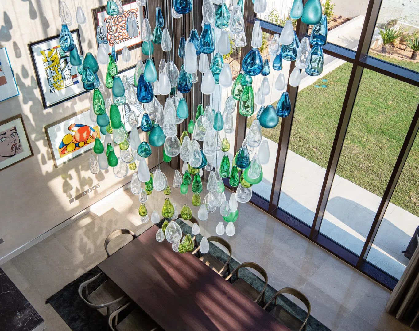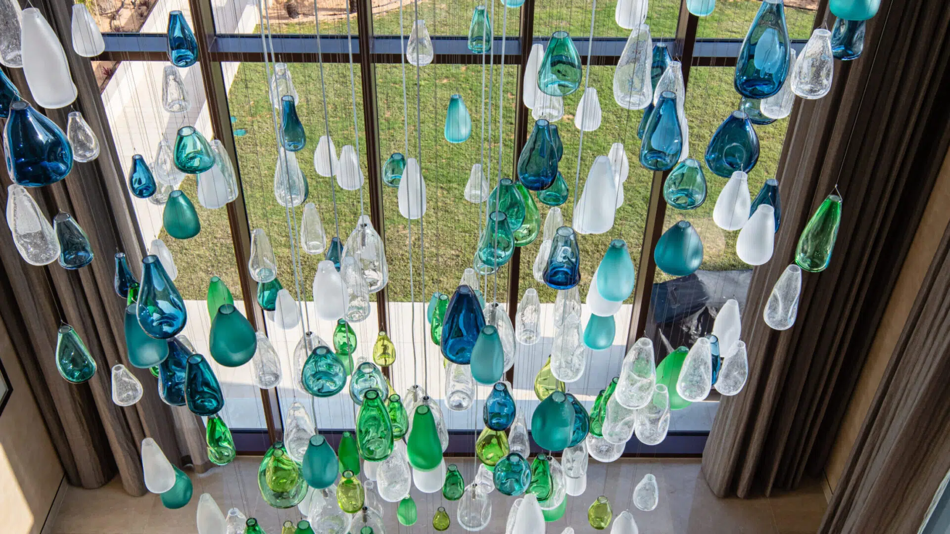 The sculpture is composed of 238 blown-glass components in four distinct forms, each tinted in soft blue-green hues that echo the depth and stillness of the ocean.