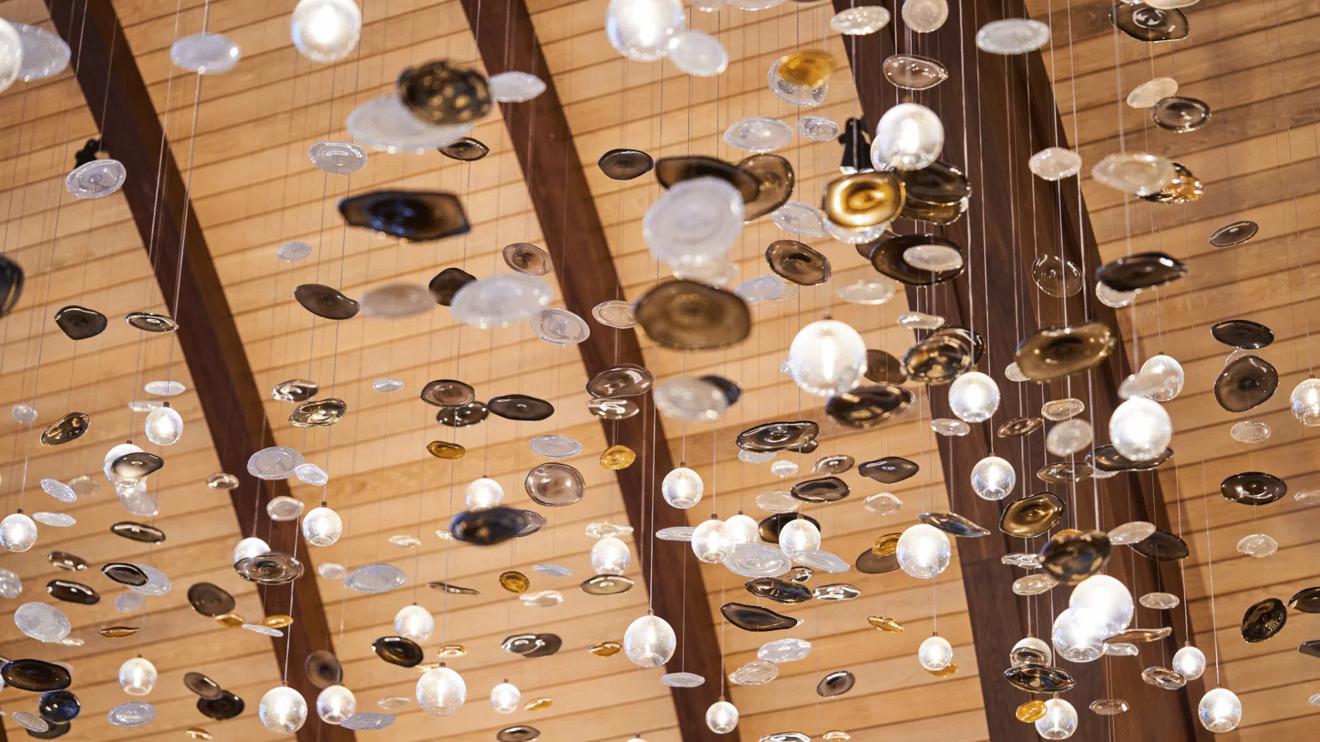 Integrated seamlessly with the lobby’s palette and natural materials, the installation creates a warm, welcoming atmosphere. It turns light into movement, movement into calm: an encounter with nature translated into glass.